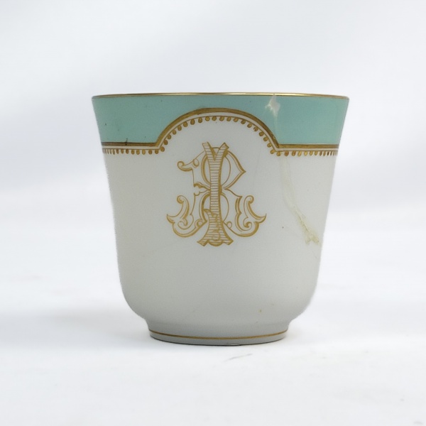 • BARÃO DA GUANABARA - JOSE GONÇALVES DE OLIVEIRA ROXO GUANABARA (BARRA DO PIRAÍ, 13 DE ABRIL DE 1832 RIO DE JANEIRO, 11 DE JUNHO DE 1875) FILHO DOS BARÕES DE VARGEM ALEGRE SENDO QUE A BARONESA DE VARGEM ALEGRE, DONA JOAQUINA CLARA DE MORAES, ERA FILHA DO BARÃO DE PIRÁY PORTANTO O BARÃO DE GUANABARA ERA PRIMO EM PRIMEIRO GRAU DA MÃE DE DONA MARIA THEREZA MONTEIRO DE BARROS, EM HOMENAGEM DE QUEM FOI BATIZADA A FAZENDA DE SANTA THEREZA. AINDA MAIS O BARÃO FOI CASADO COM DONA JOAQUINA CLARA DE MORAES, FILHA DE DONA EMILIANA UMBELINA BREVES DE MORAIS, CONDESSA DO TOCANTINS, E FILHA DO BARÃO DE PIRAY. DONA UMBELINA FOI CASADA COM JOSÉ JOAQUIM DE LIMA E SILVA SOBRINHO, 1º CONDE DE TOCANTINS, FILHO DO BARÃO DE BARRA GRANDE, FRANCISCO DE LIMA E SILVA, SENDO O BARÃO, IRMÃO DO DUQUE DE CAXIAS. MUITO RARA XÍCARA PARA CHOCOLATE   EM PORCELANA DO SERVIÇO DO BARÃO DE GUANABARA, MARCAR DO ATELIER DE CHARLES PILLIVUIT, MEDAILLE DOR 1867. BORDA  COM BARRADO EM VERDE AGUA. DELIMITADO POR FRISOS EM OURO REMATADOS POR PEROLADO. EM RESERVA MONOGRAMA JR ENTRELAÇADO. PERTENCEU AO SERVIÇO DE JOSÉ GONÇALVES DE OLIVEIRA ROXO, PRIMEIRO E ÚNICO BARÃO DE GUANABARA EXEMPLAR DESSE SERVIÇO ESTÁ REPRODUZIDO NA PÁGINA 262 DO LIVRO LOUÇA DA ARISTOCRACIA NO BRASIL DA JENNY DREYFFUS.FRANÇA, SEC. XIX. 8 CM DE ALTURA (COM RESTAURO)NOTA: O Barão de Guanabara e sua esposa eram representantes da alta aristocracia cafeeira do Vale do Café fluminense. Casaram-se muito jovens, ele com 18 anos e ela com 14 anos. Eram primos irmãos. O Barão de Vargem Alegre. Ele era filho de Mathias Gonçalves de Oliveira Roxo. O Português Mathias Gonçalves de Oliveira Roxo, primeiro Barão e Visconde de Vargem Alegre (1804-1879) foi um dos mais ricos proprietários de terras do Império do Brasil chegando a ter mais de mil escravos em suas lavouras de café. Radicou-se no Brasil em 1816, onde se casou com Joaquina Clara de Morais, nascida em Mangalarga aos 15 de outubro de 1815 e falecida no Rio de Janeiro em 1865, com cinquenta anos de idade, filha do barão de Piraí. Tiveram catorze filhos.Quando da participação do Brasil na Guerra do Paraguai , colocou sua fortuna pessoal a disposição do Imperador Dom Pedro II , que lhe concedeu o Título de Barão e Grande do Império em 1867. Foi também nomeado Cavaleiro da Ordem da Rosa em 1848, e Comendador da Ordem de Cristo . Conta o grande escritor Alberto Lamego ( O Homem e a Serra ) que em 1854 o Barão era o maior fazendeiro do Império, contando em suas Fazendas com mais de 1.500 escravos. ( no seu inventário em 1879, existiam 1.189 peças). Luís Otávio de Oliveira Roxo, filho do Barão, também lutou na Guerra do Paraguai, como coronel da Guarda Nacional, ao lado dos escravos alforriados do Pai. Em 1882, recebeu o título de segundo visconde de Vargem Alegre por seus serviços prestados na Guerra Faleceu o primeiro Barão, a 16-09-1879 em Vargem Alegre-RJ. com 75 anos de idade. Em seu testamento, Mathias Gonçalves de Oliveira Roxo incluiu alguns de seus escravos: "Deixo à preta Maria Pequena, acima liberta, a quantia de cem mil Reis; a Preciliana, liberta, filha da mesma Maria Pequena, a quantia de seiscentos mil Reis. Deixo a quantia de quatro mil Reis à cada um de meus escravos, residentes na Vargem Alegre, e que tiverem de onze anos para cima de idade, ao tempo de meu falecimento. Nesta mesmas condições, deixo a quantia de três mil Reis, à cada um dos residentes nas Fazendas União, Bom Sucesso e Espuma.Peço a meus testamenteiros e herdeiros, que, no caso de quererem todos ou alguns deles, libertos residirem nas fazendas, ali os acomodem proporcionando-lhes meios de subsistência e tratamento conveniente enquanto viverem, e protegendo-os em caso de necessidade; e aos mesmos libertos recomendo, e espero que se tornem dignos desta proteção por seu procedimento, obediência e respeito para com os ditos meus herdeiros e testamenteiros"Uma de suas propriedades mais conhecidas foi a Fazenda Ponte Alta, localizada no município de Barra do Piraí. O Barão de Vargem Alegre Teve 14 filhos:JOSÉ GONÇALVES DE OLIVEIRA ROXO Barão da GuanabaraJOSÉ GONÇALVES DE OLIVEIRA ROXO foi o primeiro e único Barão de Guanabara (Barra do Piraí, 13 de abril de 1832 Rio de Janeiro, 11 de junho de 1875). Filho mais velho do Barão de Vargem Alegre, casou com sua prima-irmã Emiliana Clara Gonçalves de Morais (ele com 18 anos, ela com 14 anos de idade) e tiveram apenas dois filhos: José Antero de Oliveira Roxo e Matias Otávio de Oliveira Roxo. Recebeu o título de barão por carta de 17 de abril de 1875.RITA CLARA GONÇALVES DE OLIVEIRA ROXO - Baronesa de Santa Maria: RITA CLARA GONÇALVES DE OLIVEIRA ROXO nasceu em 29/05/1833 e faleceu em 20/08/1912 no Rio de Janeiro. Casou-se com NICOLAU NETTO CARNEIRO LEÃO, nasceu em 1829 em Tiradentes, MG (batizado em 29/07/1829 em Tiradentes), e faleceu em 16/12/1894 em Tiradentes, estando sepultado no cemitério da Igreja de Nossa Senhora das Mercês, em São João del Rei, MG. Barão de Santa Maria. Proprietário da Fazenda dos Alpes (café), em Barra Mansa, RJ.AUGUSTO CÉSAR DE OLIVEIRA ROXO, FREDERICO GUSTAVO DE OLIVEIRA ROXO, FRANCISCA OLIVEIRA ROXO. FRANCISCA DE OLIVEIRA ROXO (Chiquinha) nasceu em 10/10/1843 em Piraí, RJ e faleceu em 13/06/1920 no Rio de Janeiro. Casada com CUSTÓDIO DE SOUZA PINTO. RAYMUNDO BREVES DE OLIVEIRA ROXO Raymundo Breves de Oliveira Roxo nasceu em 03/06/1845 e faleceu em 08/12/1912. Casado com sua prima-irmã MARIA RITA MONTEIRO DE BARROS - RITOCA em 13/06/1868 no Rio de Janeiro, RJ. A mãe de Raymundo (Joaquina Clara de Moraes) e a mãe de Maria Rita (Cecilia Gonçalves de Moraes) eram irmas. Raymundo recebeu, como herança de seu pai Mathias Gonçalves de Oliveira Roxo, a Fazenda Ponte Alta em Barra do Pirai. Ritoca era irmã de Dona Maria Thereza Monteiro de Barros. MARIA TERESA DE OLIVEIRA ROXO LUIZ OCTAVIO DE OLIVEIRA ROXO 2º Visconde de Vargem Alegre LUIZ OCTAVIO DE OLIVEIRA ROXO na