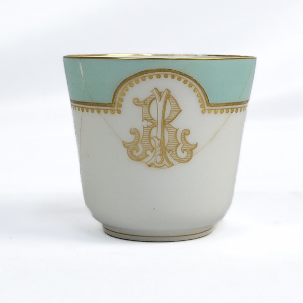 • BARÃO DA GUANABARA - JOSE GONÇALVES DE OLIVEIRA ROXO GUANABARA (BARRA DO PIRAÍ, 13 DE ABRIL DE 1832 RIO DE JANEIRO, 11 DE JUNHO DE 1875) FILHO DOS BARÕES DE VARGEM ALEGRE SENDO QUE A BARONESA DE VARGEM ALEGRE, DONA JOAQUINA CLARA DE MORAES, ERA FILHA DO BARÃO DE PIRÁY PORTANTO O BARÃO DE GUANABARA ERA PRIMO EM PRIMEIRO GRAU DA MÃE DE DONA MARIA THEREZA MONTEIRO DE BARROS, EM HOMENAGEM DE QUEM FOI BATIZADA A FAZENDA DE SANTA THEREZA. AINDA MAIS O BARÃO FOI CASADO COM DONA JOAQUINA CLARA DE MORAES, FILHA DE DONA EMILIANA UMBELINA BREVES DE MORAIS, CONDESSA DO TOCANTINS, E FILHA DO BARÃO DE PIRAY. DONA UMBELINA FOI CASADA COM JOSÉ JOAQUIM DE LIMA E SILVA SOBRINHO, 1º CONDE DE TOCANTINS, FILHO DO BARÃO DE BARRA GRANDE, FRANCISCO DE LIMA E SILVA, SENDO O BARÃO, IRMÃO DO DUQUE DE CAXIAS. MUITO RARA XÍCARA DE CHÁ  EM PORCELANA DO SERVIÇO DO BARÃO DE GUANABARA, MARCAR DO ATELER DE CHARLES PILLIVUIT, MEDAILLE DOR 1867. BORDA  COM BARRADO EM VERDE AGUA. DELIMITADO POR FRISOS EM OURO REMATADOS POR PEROLADO. EM RESERVA MONOGRAMA JR ENTRELAÇADO. PERTENCEU AO SERVIÇO DE JOSÉ GONÇALVES DE OLIVEIRA ROXO, PRIMEIRO E ÚNICO BARÃO DE GUANABARA EXEMPLAR DESSE SERVIÇO ESTÁ REPRODUZIDO NA PÁGINA 262 DO LIVRO LOUÇA DA ARISTOCRACIA NO BRASIL DA JENNY DREYFFUS.FRANÇA, SEC. XIX. 12 CM DE DIAMETRONOTA: O Barão de Guanabara e sua esposa eram representantes da alta aristocracia cafeeira do Vale do Café fluminense. Casaram-se muito jovens, ele com 18 anos e ela com 14 anos. Eram primos irmãos. O Barão de Vargem Alegre. Ele era filho de Mathias Gonçalves de Oliveira Roxo. O Português Mathias Gonçalves de Oliveira Roxo, primeiro Barão e Visconde de Vargem Alegre (1804-1879) foi um dos mais ricos proprietários de terras do Império do Brasil chegando a ter mais de mil escravos em suas lavouras de café. Radicou-se no Brasil em 1816, onde se casou com Joaquina Clara de Morais, nascida em Mangalarga aos 15 de outubro de 1815 e falecida no Rio de Janeiro em 1865, com cinquenta anos de idade, filha do barão de Piraí. Tiveram catorze filhos.Quando da participação do Brasil na Guerra do Paraguai , colocou sua fortuna pessoal a disposição do Imperador Dom Pedro II , que lhe concedeu o Título de Barão e Grande do Império em 1867. Foi também nomeado Cavaleiro da Ordem da Rosa em 1848, e Comendador da Ordem de Cristo . Conta o grande escritor Alberto Lamego ( O Homem e a Serra ) que em 1854 o Barão era o maior fazendeiro do Império, contando em suas Fazendas com mais de 1.500 escravos. ( no seu inventário em 1879, existiam 1.189 peças). Luís Otávio de Oliveira Roxo, filho do Barão, também lutou na Guerra do Paraguai, como coronel da Guarda Nacional, ao lado dos escravos alforriados do Pai. Em 1882, recebeu o título de segundo visconde de Vargem Alegre por seus serviços prestados na Guerra Faleceu o primeiro Barão, a 16-09-1879 em Vargem Alegre-RJ. com 75 anos de idade. Em seu testamento, Mathias Gonçalves de Oliveira Roxo incluiu alguns de seus escravos: "Deixo à preta Maria Pequena, acima liberta, a quantia de cem mil Reis; a Preciliana, liberta, filha da mesma Maria Pequena, a quantia de seiscentos mil Reis. Deixo a quantia de quatro mil Reis à cada um de meus escravos, residentes na Vargem Alegre, e que tiverem de onze anos para cima de idade, ao tempo de meu falecimento. Nesta mesmas condições, deixo a quantia de três mil Reis, à cada um dos residentes nas Fazendas União, Bom Sucesso e Espuma.Peço a meus testamenteiros e herdeiros, que, no caso de quererem todos ou alguns deles, libertos residirem nas fazendas, ali os acomodem proporcionando-lhes meios de subsistência e tratamento conveniente enquanto viverem, e protegendo-os em caso de necessidade; e aos mesmos libertos recomendo, e espero que se tornem dignos desta proteção por seu procedimento, obediência e respeito para com os ditos meus herdeiros e testamenteiros"Uma de suas propriedades mais conhecidas foi a Fazenda Ponte Alta, localizada no município de Barra do Piraí. O Barão de Vargem Alegre Teve 14 filhos:JOSÉ GONÇALVES DE OLIVEIRA ROXO Barão da GuanabaraJOSÉ GONÇALVES DE OLIVEIRA ROXO foi o primeiro e único Barão de Guanabara (Barra do Piraí, 13 de abril de 1832 Rio de Janeiro, 11 de junho de 1875). Filho mais velho do Barão de Vargem Alegre, casou com sua prima-irmã Emiliana Clara Gonçalves de Morais (ele com 18 anos, ela com 14 anos de idade) e tiveram apenas dois filhos: José Antero de Oliveira Roxo e Matias Otávio de Oliveira Roxo. Recebeu o título de barão por carta de 17 de abril de 1875.RITA CLARA GONÇALVES DE OLIVEIRA ROXO - Baronesa de Santa Maria: RITA CLARA GONÇALVES DE OLIVEIRA ROXO nasceu em 29/05/1833 e faleceu em 20/08/1912 no Rio de Janeiro. Casou-se com NICOLAU NETTO CARNEIRO LEÃO, nasceu em 1829 em Tiradentes, MG (batizado em 29/07/1829 em Tiradentes), e faleceu em 16/12/1894 em Tiradentes, estando sepultado no cemitério da Igreja de Nossa Senhora das Mercês, em São João del Rei, MG. Barão de Santa Maria. Proprietário da Fazenda dos Alpes (café), em Barra Mansa, RJ.AUGUSTO CÉSAR DE OLIVEIRA ROXO, FREDERICO GUSTAVO DE OLIVEIRA ROXO, FRANCISCA OLIVEIRA ROXO. FRANCISCA DE OLIVEIRA ROXO (Chiquinha) nasceu em 10/10/1843 em Piraí, RJ e faleceu em 13/06/1920 no Rio de Janeiro. Casada com CUSTÓDIO DE SOUZA PINTO. RAYMUNDO BREVES DE OLIVEIRA ROXO Raymundo Breves de Oliveira Roxo nasceu em 03/06/1845 e faleceu em 08/12/1912. Casado com sua prima-irmã MARIA RITA MONTEIRO DE BARROS - RITOCA em 13/06/1868 no Rio de Janeiro, RJ. A mãe de Raymundo (Joaquina Clara de Moraes) e a mãe de Maria Rita (Cecilia Gonçalves de Moraes) eram irmas. Raymundo recebeu, como herança de seu pai Mathias Gonçalves de Oliveira Roxo, a Fazenda Ponte Alta em Barra do Pirai. Ritoca era irmã de Dona Maria Thereza Monteiro de Barros. MARIA TERESA DE OLIVEIRA ROXO LUIZ OCTAVIO DE OLIVEIRA ROXO 2º Visconde de Vargem Alegre LUIZ OCTAVIO DE OLIVEIRA ROXO nasceu em 28/08/1850 em